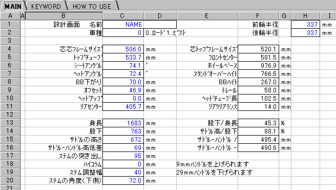 ノーマルサイズフレームのロード、ピストレーサーのスケルトンを決定する簡易プログラムです。パイプのカット寸法などの計算は省略していますが、おおむね現実的な寸法(車輪が干渉しない寸法等)が得られるようにしています。元データはLotus1-2-3 98で作成し、123形式、xls95形式で保存したものをまとめて圧縮しています。 |