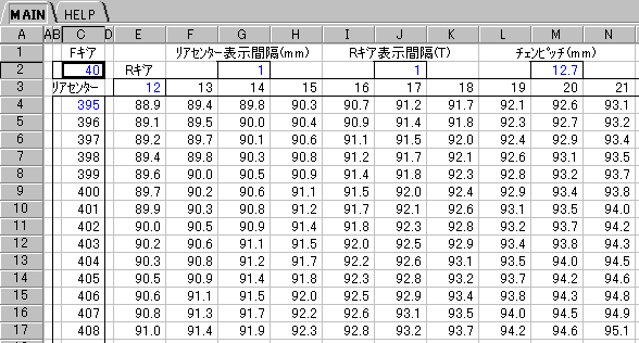 ピストレーサーや普通車などの外装変速機を持たない自転車で、前後のギアの組み合わせとチェンのコマ数、リアセンターの適正な関係をもとめるプログラムです。元データはLotus1-2-3 98で作成し、123形式、xls95形式で保存したものを