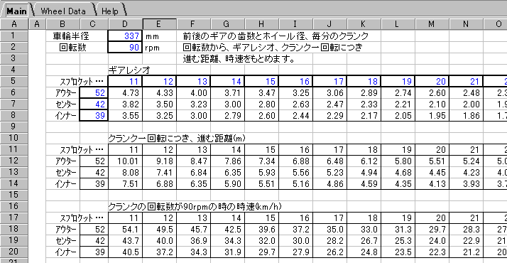 車輪径、前後のギア歯数からギア比、クランク1回転につき進む距離、時速をもとめるプログラムです。元データはLotus1-2-3 98で作成し、123形式、xls95形式で保存したものを