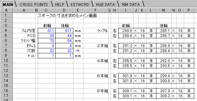 自転車のハブ、リムの寸法から、スポークの長さと交点を求めるプログラムです。少々古いのですが、ハブとリムのデータも一部含まれています。元データは Lotus1-2-3 98で作成し、123形式、xls95形式で保存したものをlzh形式で圧縮しています。 |