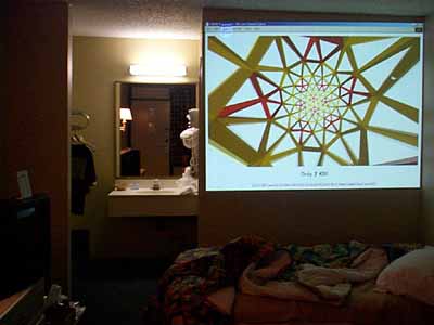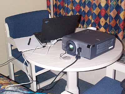 プロジェクターのチェック。スーツケースの中に入れていたので、少々心配だったが、荷物が動かないようにパッキングしてあったこともあり、特に問題なし。部屋の端から、反対側の壁に投影すると、少々距離が足りない(後に、これはピント調整で解決することに気づく)。