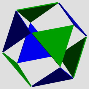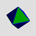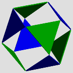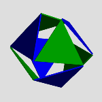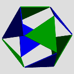 ジターバッグには12の頂点があるのですが、変形の過程でこれら頂点を適宜結ぶと正20面体を得ることができます。ひとつの多面体モデルが様々な多面体形状へと変化する好例と言えるでしょう。 |