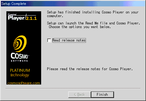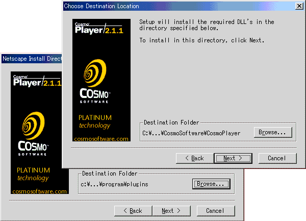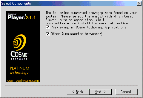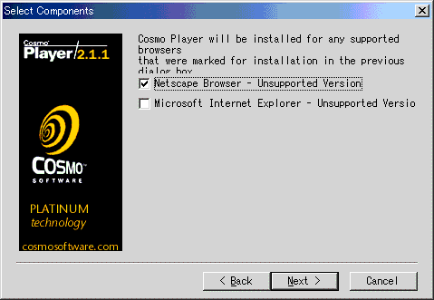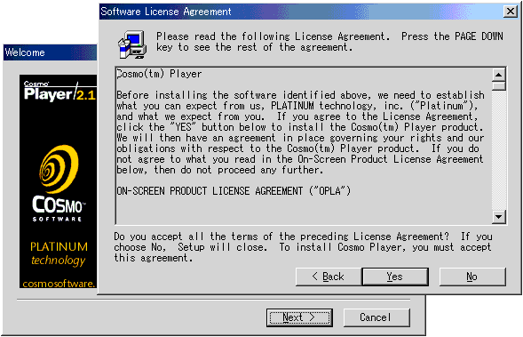 ダウンロードしたCosmoPlayerのアイコンをダブルクリックすると、インストールが開始されます。Windows2000用としたCosmoPlayerはありませんので、Win95、WinNT用のものをダウンロードしてインストールします。CosmoPlayerのダウンロードは、http://www.cai.com/cosmo/から行って下さい。 |