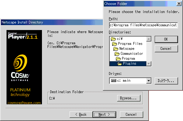 すると、「Choose Folder」ウィンドウが表示されるので、Netscapeのプラグインフォルダを開き「OK」をクリックします。 ここで勘違いをしてインストールに失敗してしまう事が多いのですが、Netscapeのプラグインフォルダを指定すると言う事に注意しなければなりません。標準的なWin2000とNetscapeのインストールを行った場合、Netscapeのプラグインフォルダは、C:\Program Files\Netscape\Communicator\Program\Plugins となります。 |