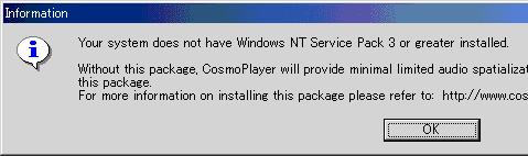 インストールしているCosmoPlayerはWin2000のことを知らない為、WinNTのサービスパック3以降が必要ですよ、と言うメッセージが表示されます。「OK」しか選択肢がないので「OK」をクリックします。 |